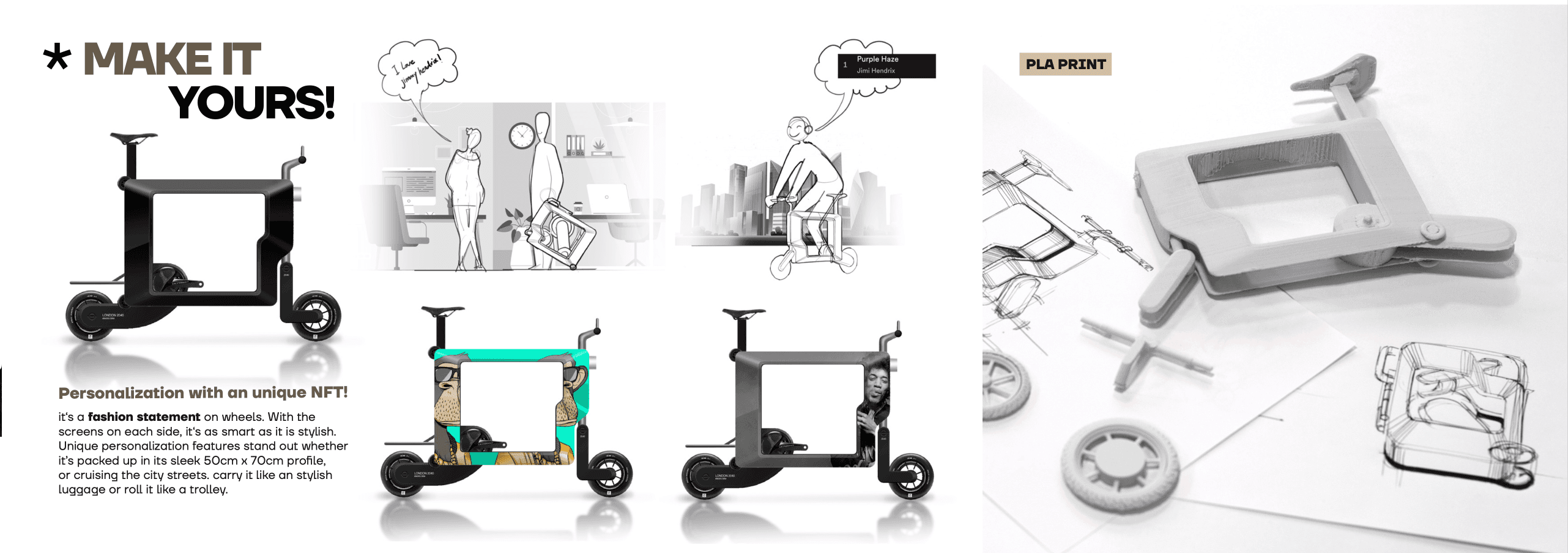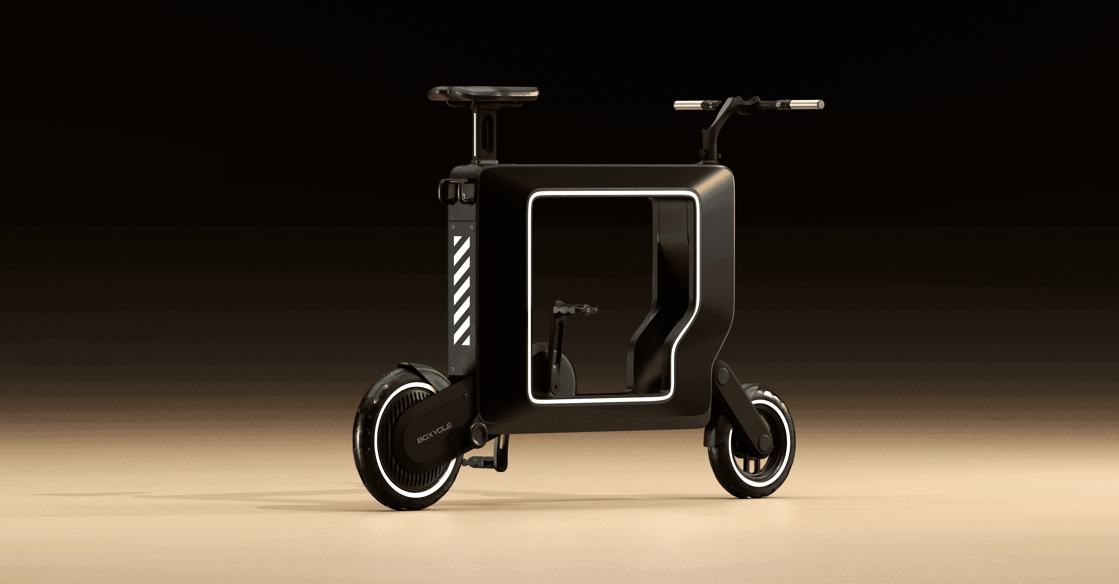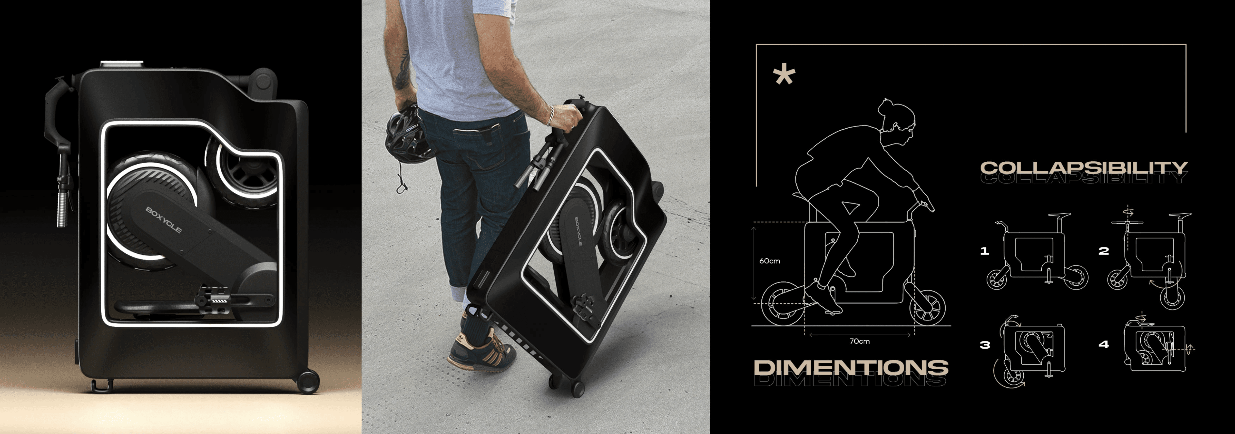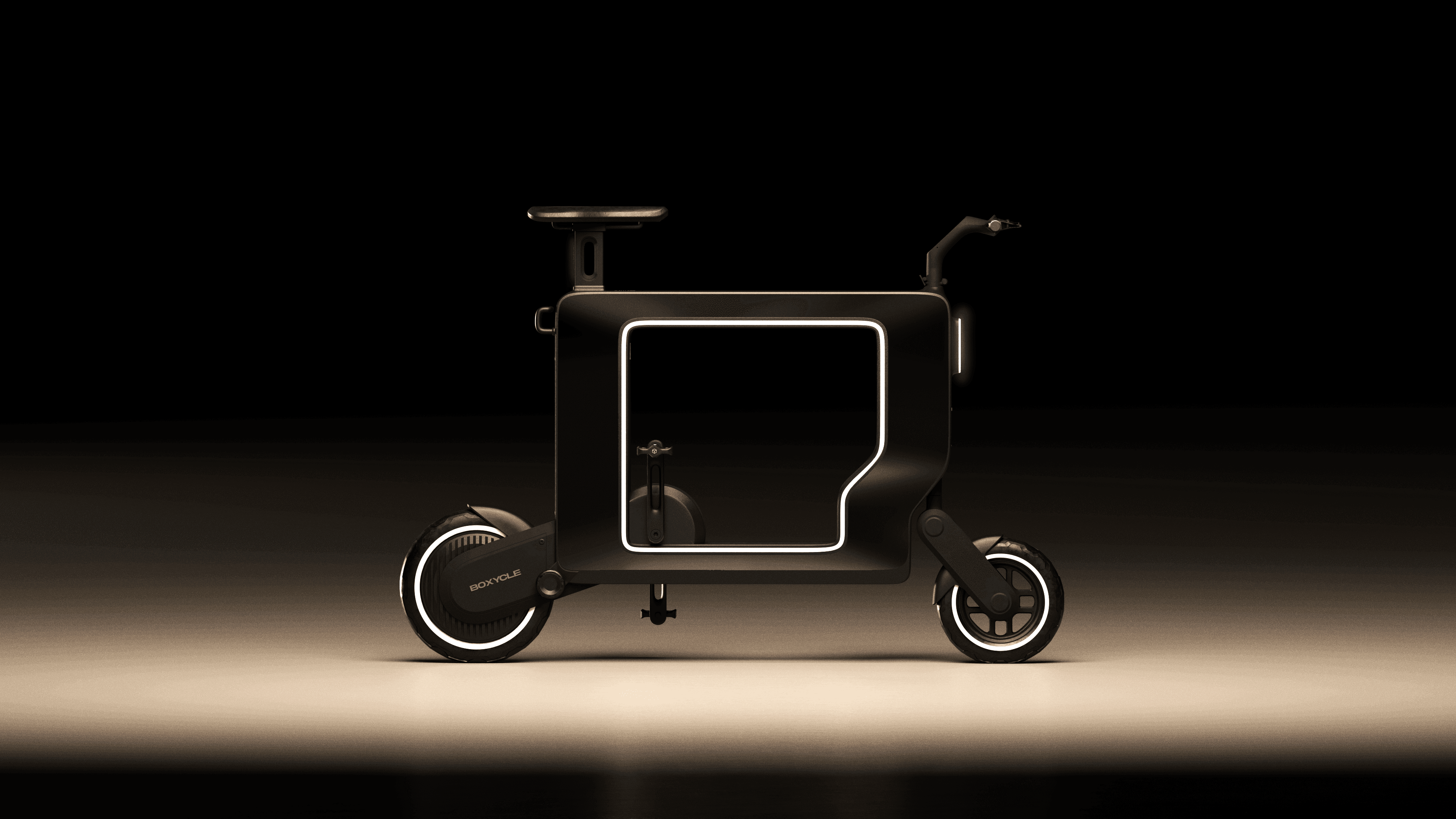 Boxycle is a foldable bicycle meticulously designed to align with the dynamic lifestyle of Londoners. Grounded in extensive research, this project has culminated in an innovative design solution. What distinguishes Boxycle from other foldable bicycles on the market is not just its exceptional styling but also its unique personalization features. Equipped with two screens that cover the frame from both sides, Boxycle transforms urban cycling into a highly personalized experience. You can choose the visuals displayed on the frame, akin to changing the background on your gadgets. Whether it's your favorite digital artwork or a flat color to match your outfit, Boxycle adapts to your personal style. When folded, Boxycle becomes a compact rectangle, measuring just 50 cm by 70 cm, with the wheels neatly tucked inside. This ingenious design allows for effortless carrying, similar to luggage or a trolley, offering unparalleled convenience for the urban commuter.