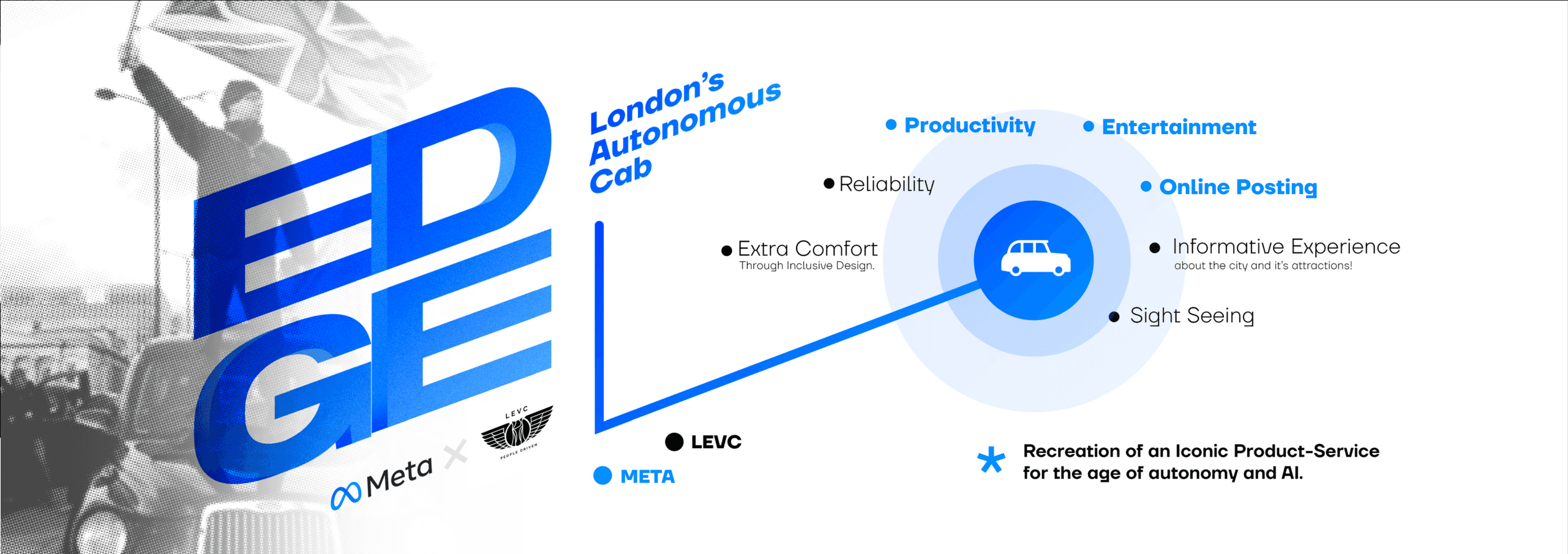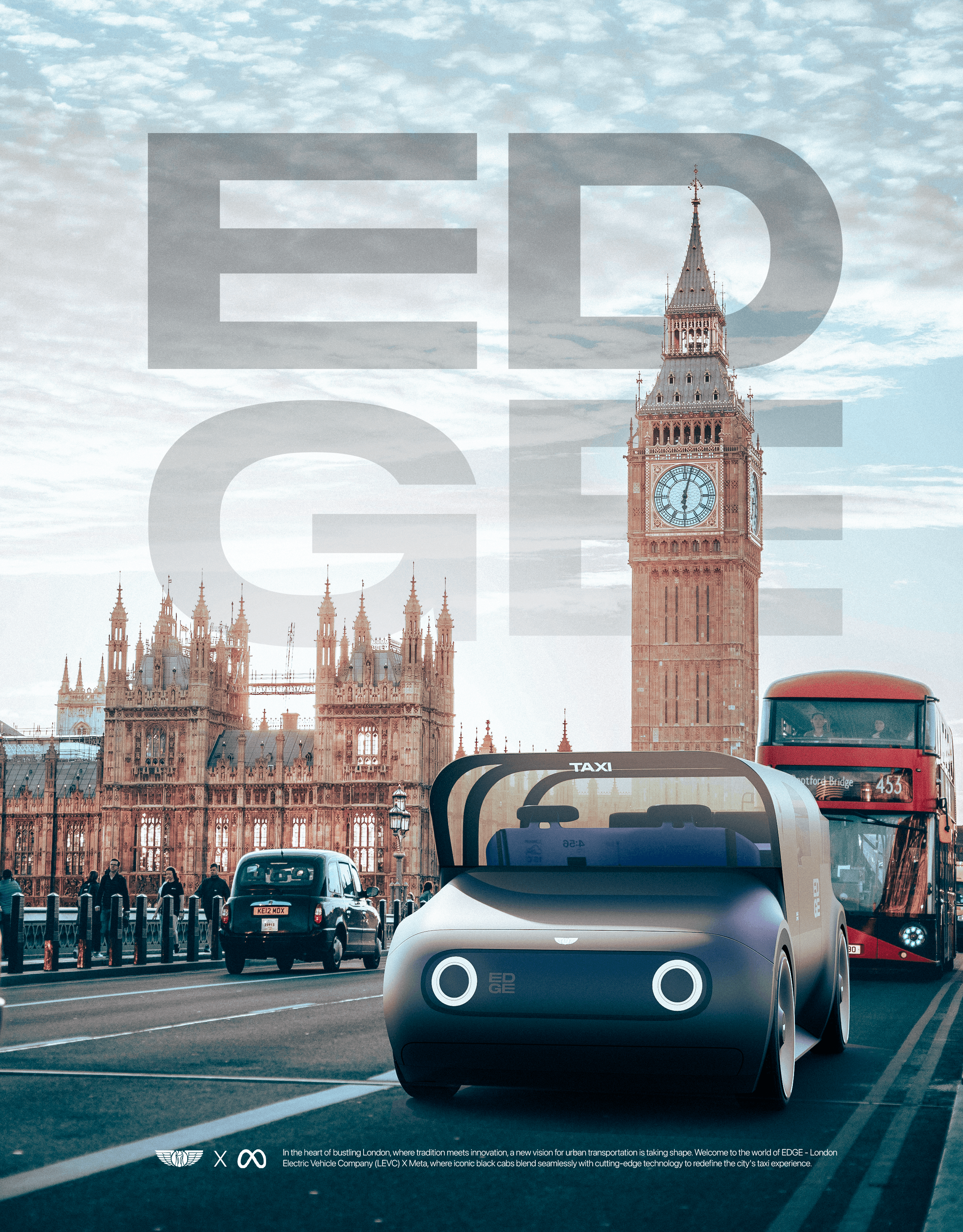 In the heart of bustling London, where tradition meets innovation, a new vision for urban transportation is taking shape. Welcome to the world of EDGE - London Electric Vehicle Company (LEVC) X Meta, where iconic black cabs blend seamlessly with cutting-edge technology to redefine the city's taxi experience. At the core of the EDGE concept lies a commitment to both tradition and progress. From its exterior design to its interior layout, every aspect of the vehicle has been meticulously crafted to embody the spirit of London while embracing the possibilities of the future.